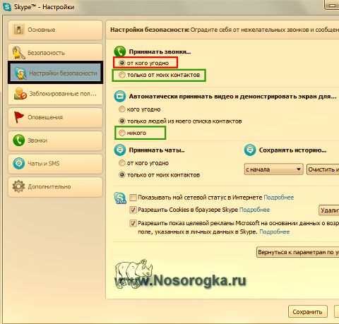 - Установка ограничений. Мы рекомендуем отключить автоматический прием звонков от любых абонентов. Зачем это нужно? Принимайте звонки по готовности, а не усмотрению программы. В противном случае может запуститься трансляция изображения, а вы об этом даже можете и не знать.